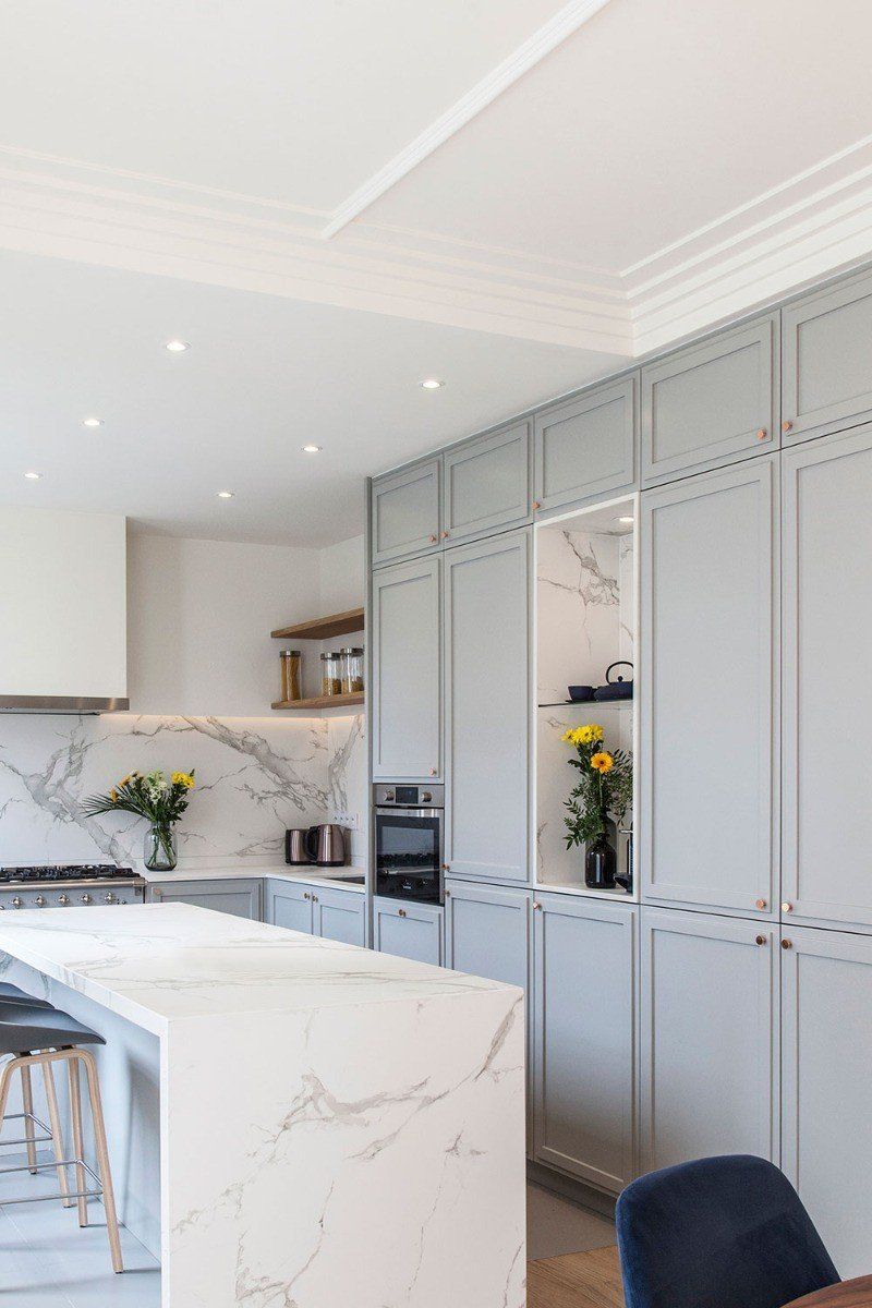 Un proyecto de Atelier DAAA. Esta casa unifamiliar, es el hogar de una pareja. Crearon un entorno espacioso pero acogedor que permite a sus dos hijos crecer sin restricciones. Tres elementos hacen que esta cocina esté llena de vida: ¿Ha visto el techo de la cocina? La combinación de la cornisa (C392 o C393) y las molduras con los rosetones ( P4020 Y R9) y los elementos de diseño crea una obra de arte interesante. La encimera de porcelánico que imita a la perfección el mármol, con todas cualidades. Proporciona a esta cocina un carácter lujoso y contemporáneo. Los sutiles zócalos (SX194), pintados del mismo color que las paredes, crean un ambiente fresco en toda la casa.